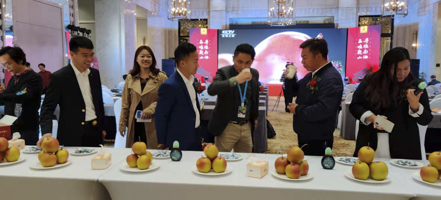 ▲施锦明向盒马鲜生总部采购专家介绍巍山红雪梨